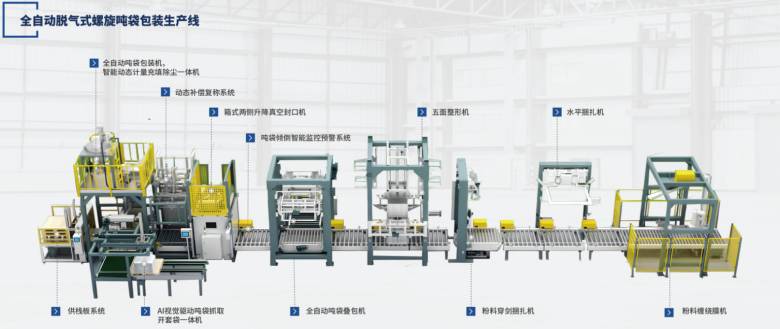 全自动吨包装抽真空封口生产线是一款集自动上袋、空托盘回收、托盘拆垛、吨包称重、抽真空封口、缠膜一体化的全自动生产线,包括空袋上线、枚取送袋、托盘拆埃入线、夹袋、吹袋、托盘拆垛、双螺旋送料、灌装、除尘、自动称重、移袋、抽真空封口、缠膜、成品出线、托盘回收等工序,主要用于粉末、颗粒物料包装、封口,能极大