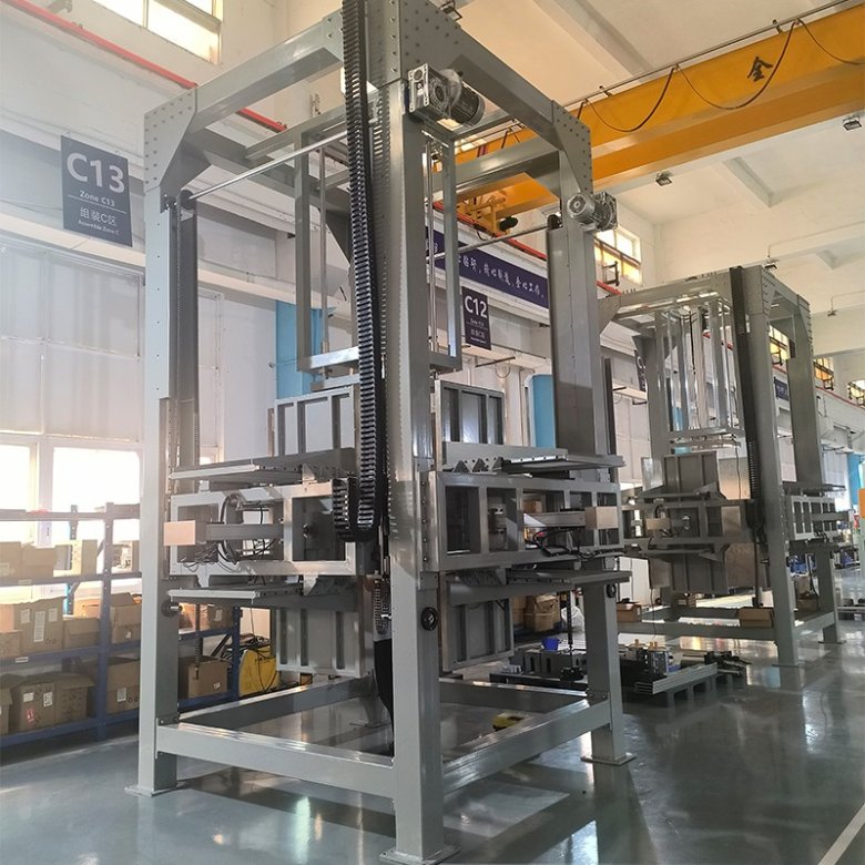 全自动吨袋叠包机的优点全自动吨袋叠包机是一种专门用于对大型包装袋(如吨袋)进行堆叠、包装和缠绕膜操作的自动化设备。它在物流、仓储、化工、建材等行业得到广泛应用,主要优点包括:高效率:全自动吨袋叠包机能够实现全自动的堆叠、包装和缠绕膜操作,减少了人工干预,提高了生产效率。 操作简便:通过触摸屏或PLC
