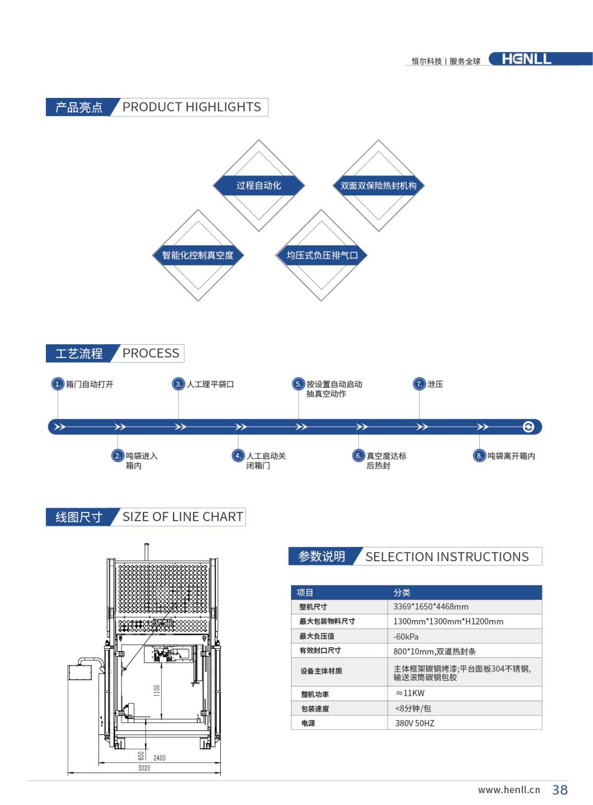 根据恒尔官方产品资料显示:恒尔吨包真空封口机的包装类型为袋,包装速度为5-9包/小时,自动化程度为全自动,工作原理为真空,恒尔吨包真空封口机的价格为280000元,具体型号是HEZF-1000,品牌为恒尔HENLL。